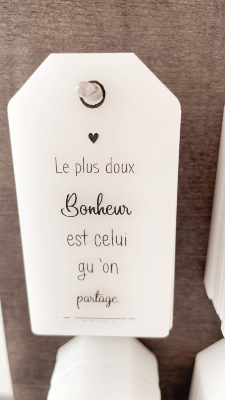 Plaquette - étiquette en plexi blanc "Le plus doux bonheur est celui qu'on partage"