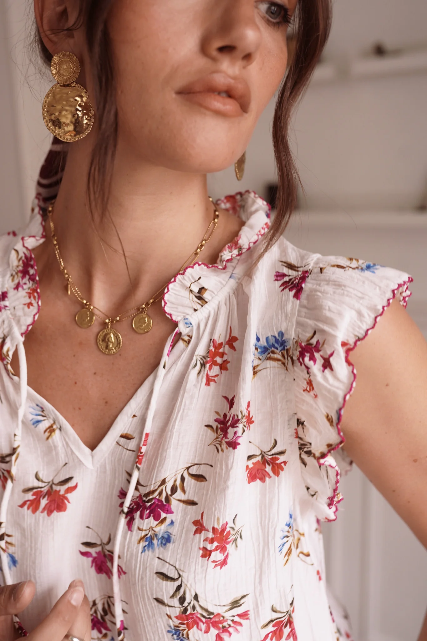 Blouse fleurie à volants, voile de coton léger, subtilement texturé. Imprimé floral délicat aux accents jaunes, oranges et verts. Encolure en V avec liens à nouer. Finitions volantées aux épaules pour une touche féminine. Une pièce romantique, douce et lumineuse