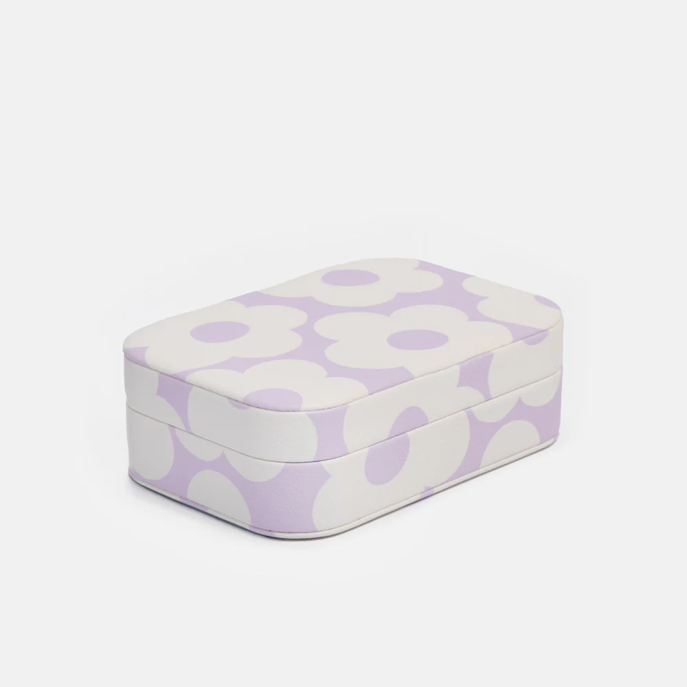 Gardez vos bijoux organisés avec cette boîte à bijoux. Construit avec un étui rigide aspect cuir avec le design fleurs lilas. L’intérieur est en suédine couleur taupe. Place disponible pour y ranger vos bagues, boucles d’oreilles, bracelets ou colliers. Pratique à emporter pour les vacances.