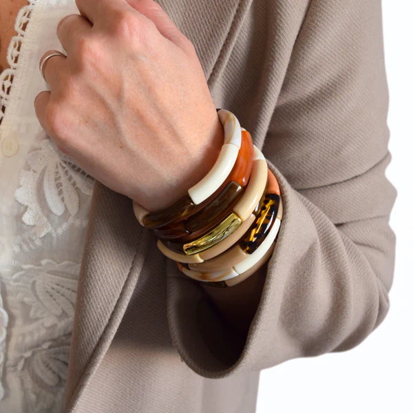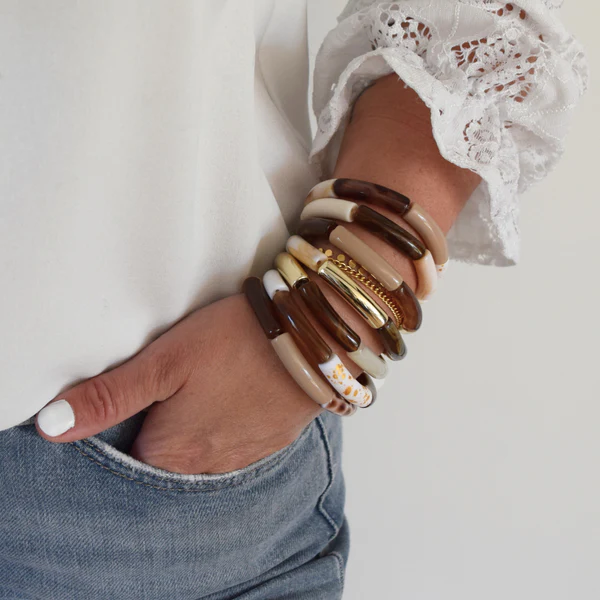 Composé de 6 perles tubes en résine, il marie les nuances chaudes de l’ambre, du caramel et du beige pour sublimer toutes les carnations.