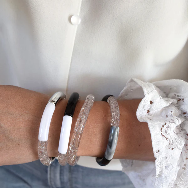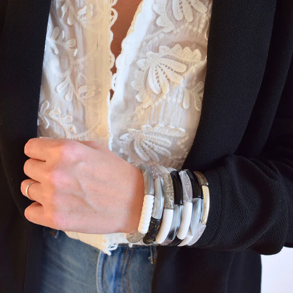 Les bracelets joncs tons noirs et blancs apportent une touche graphique et élégante à votre tenue.