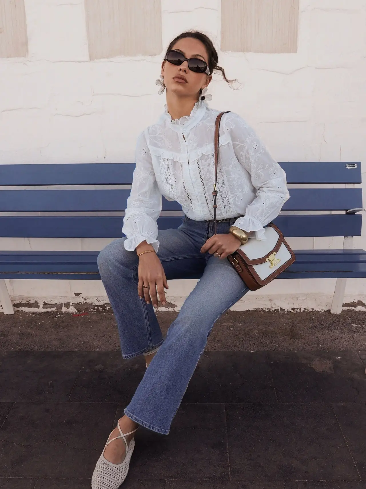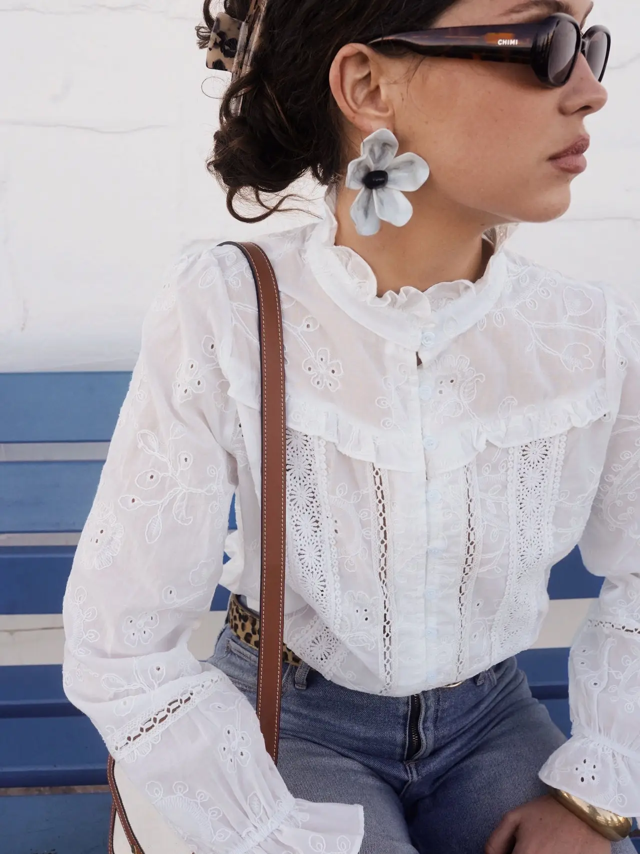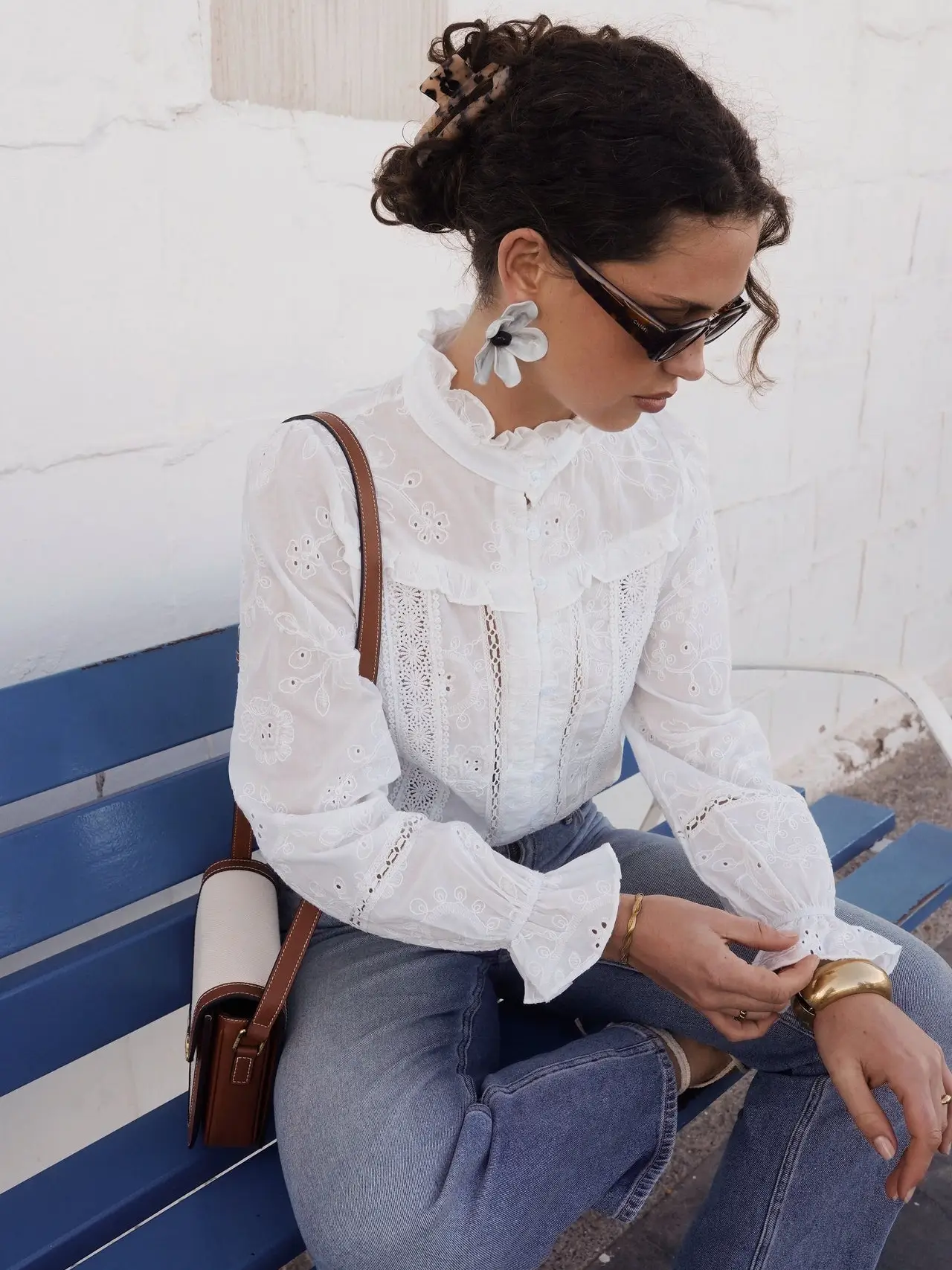 Tissu brodé avec des jeux d’ajourés, col légèrement montant froncé, poignets élastiqués.