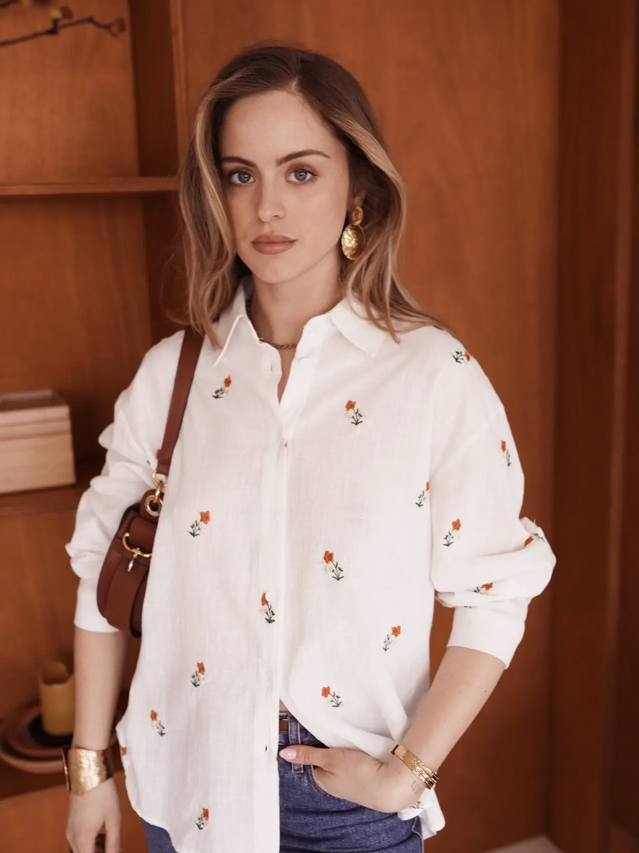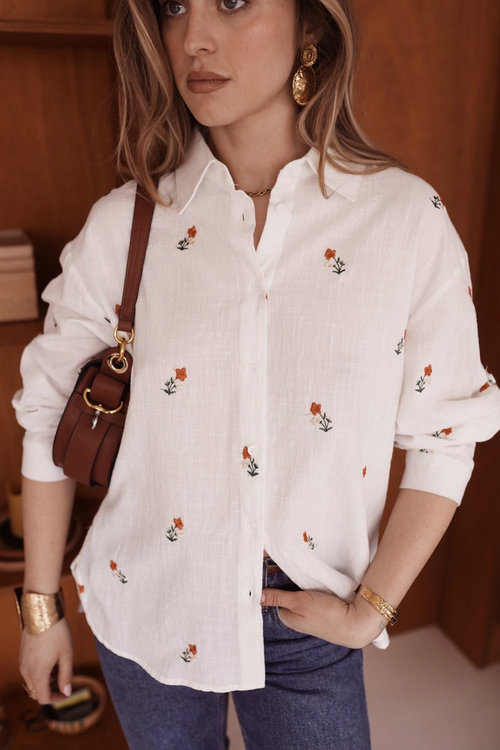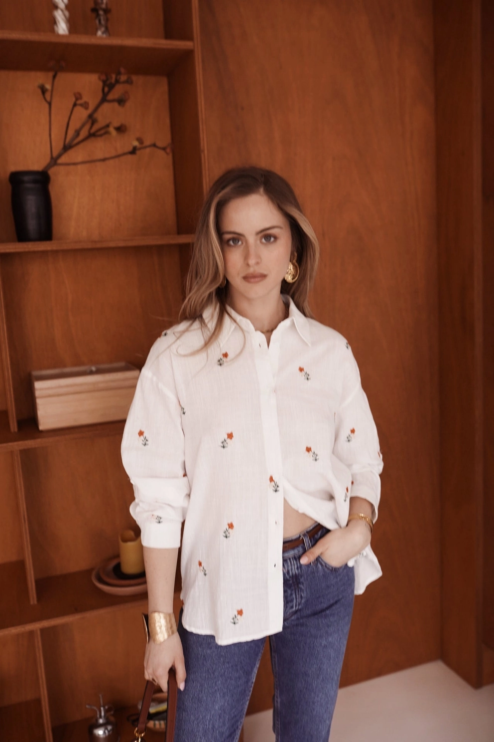 Chemise en coton léger au toucher doux, avec des broderies florales discrètes et délicates. un esprit bohème subtil.