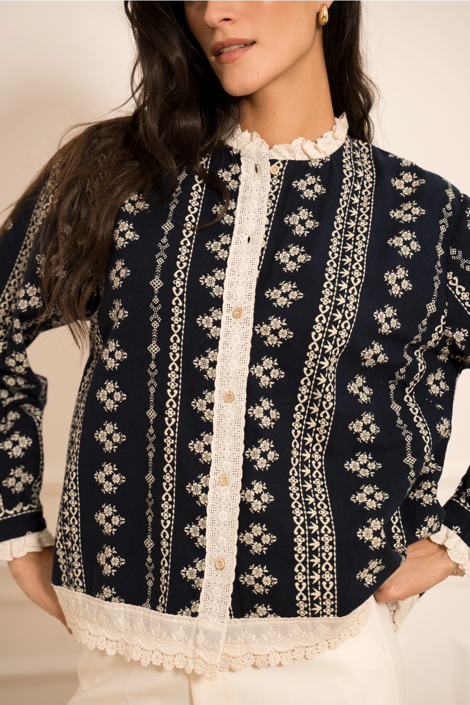 Chemise bohème en coton imprimé bandes dentelle.