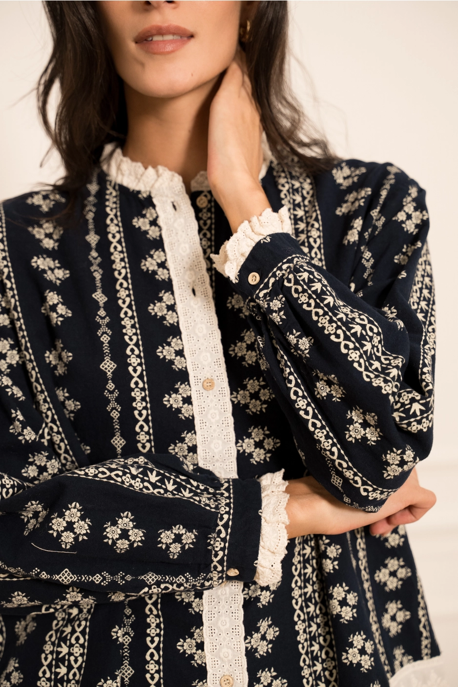 Imprimé motifs floraux écru, coupe droite et fluide, col rond avec collerette en dentelle, fermeture : Boutonnage central dissimulé sous dentelle, manches longues, finition dentelle aux poignets.