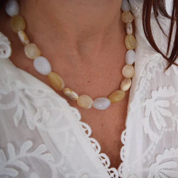 Le collier ÉLISE incarne la douceur lumineuse des teintes naturelles et la simplicité élégante d’un bijou intemporel.