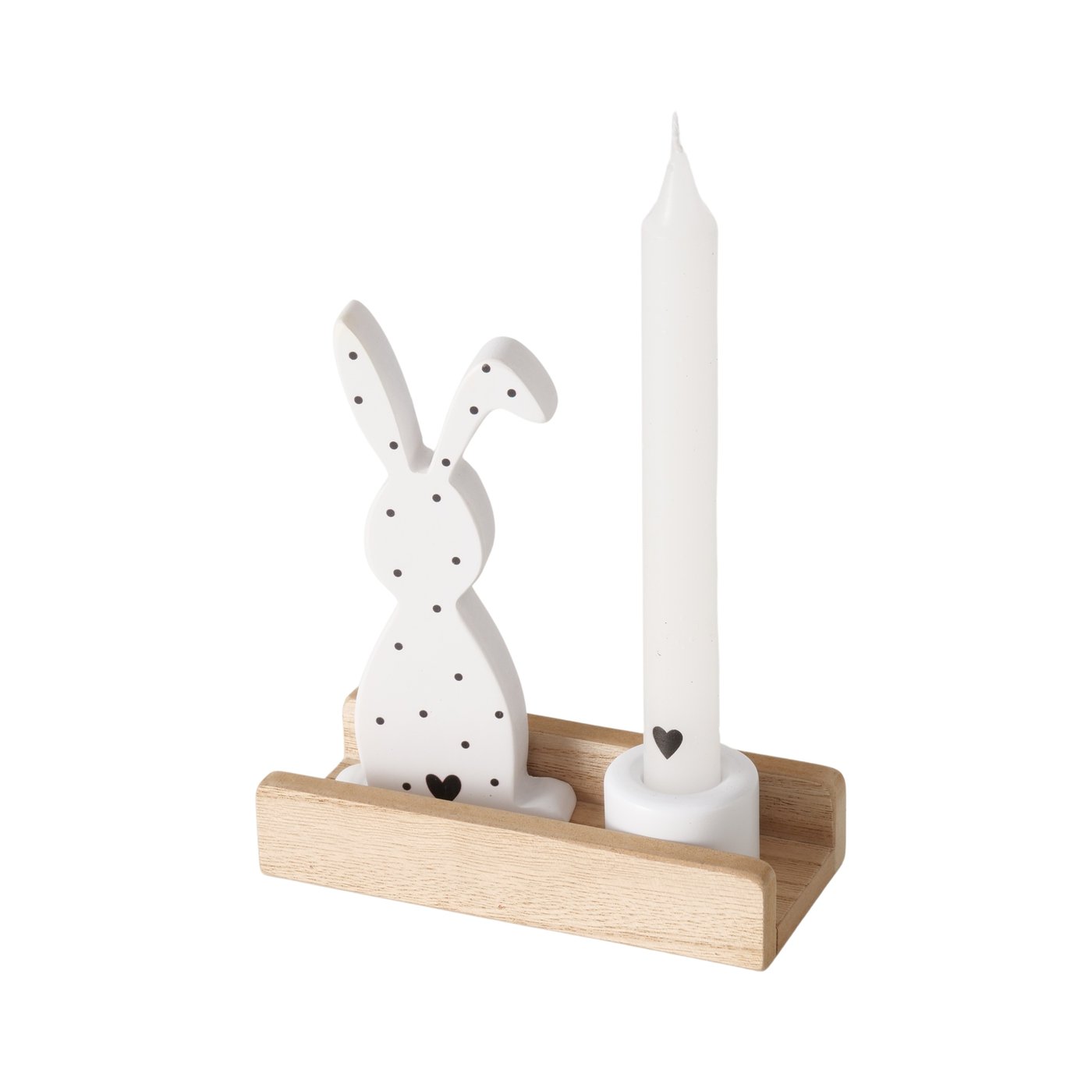 Emballage de 4 pièces : lapin avec pois noirs , socle en bois, bougeoir et bougie avec petit coeur noir à la base.