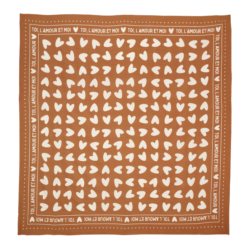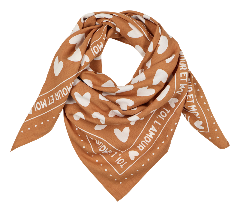 Le foulard est rempli de petit coeur et la phrase TOI, L’AMOUR ET MOI orne les bords.