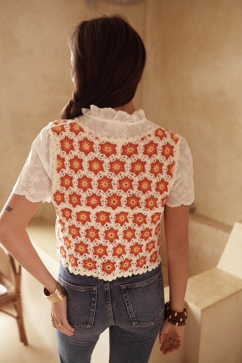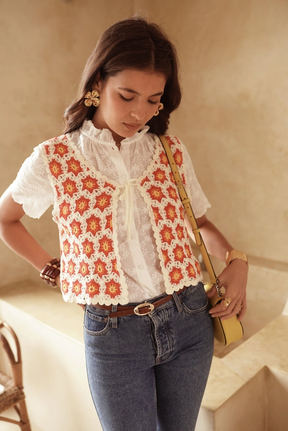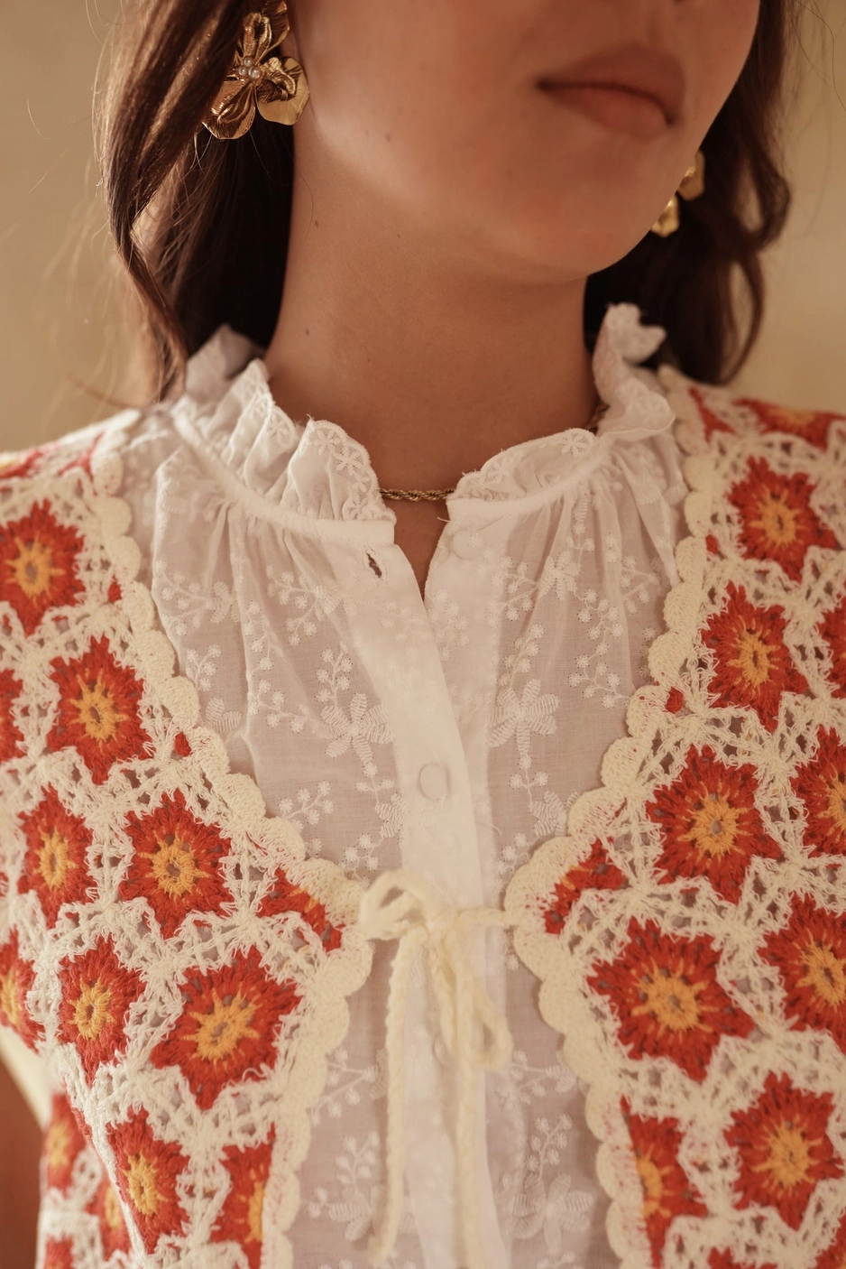 Sa coupe courte sans manches avec son lien à nouer sur le devant en font une pièce bohème et féminine, facile à porter au quotidien. 95% coton 5% polyamide
