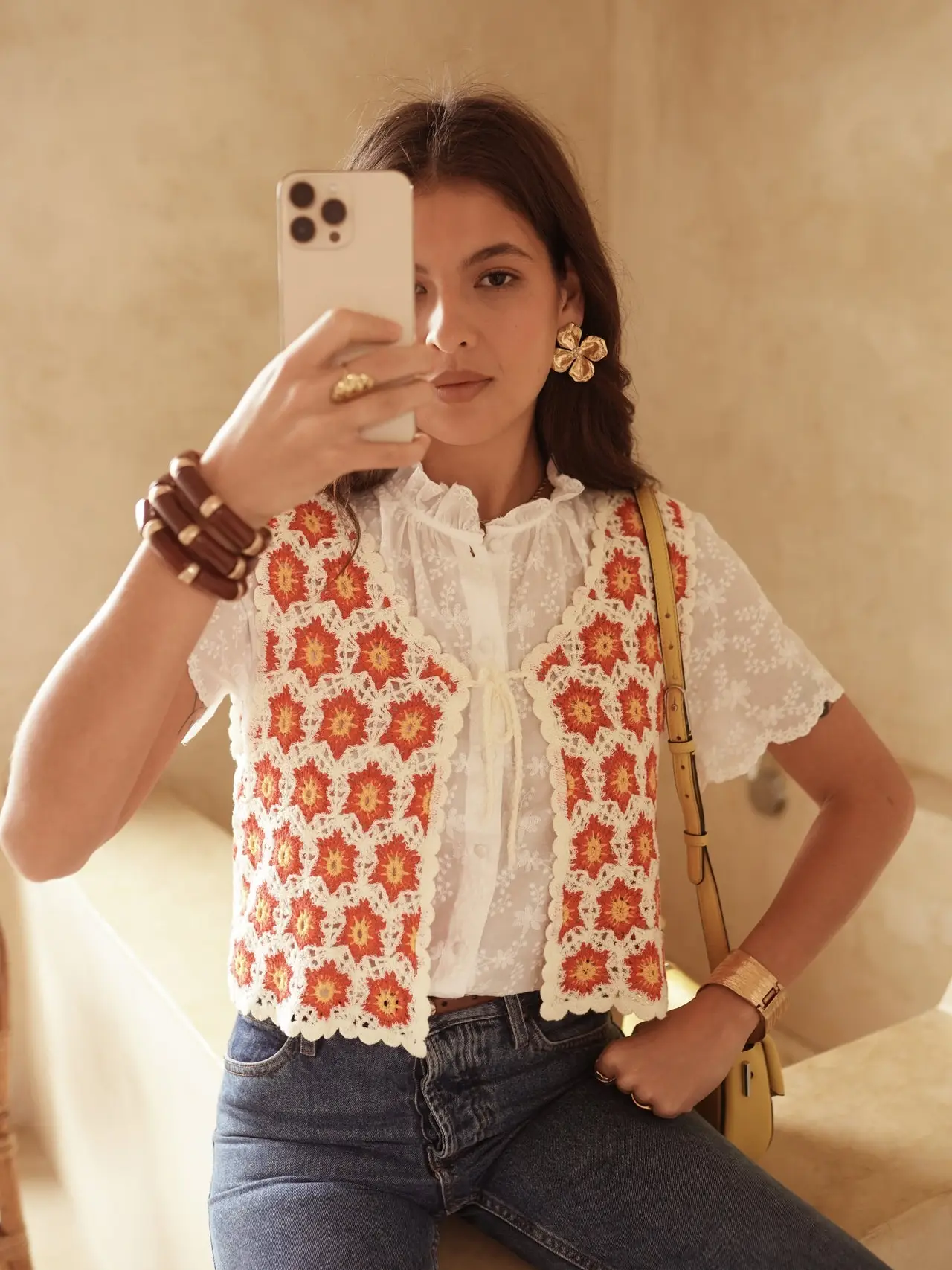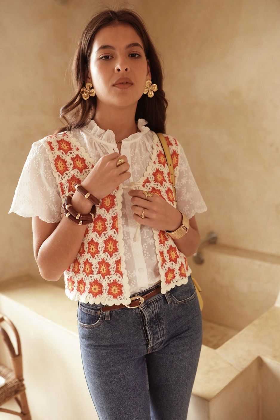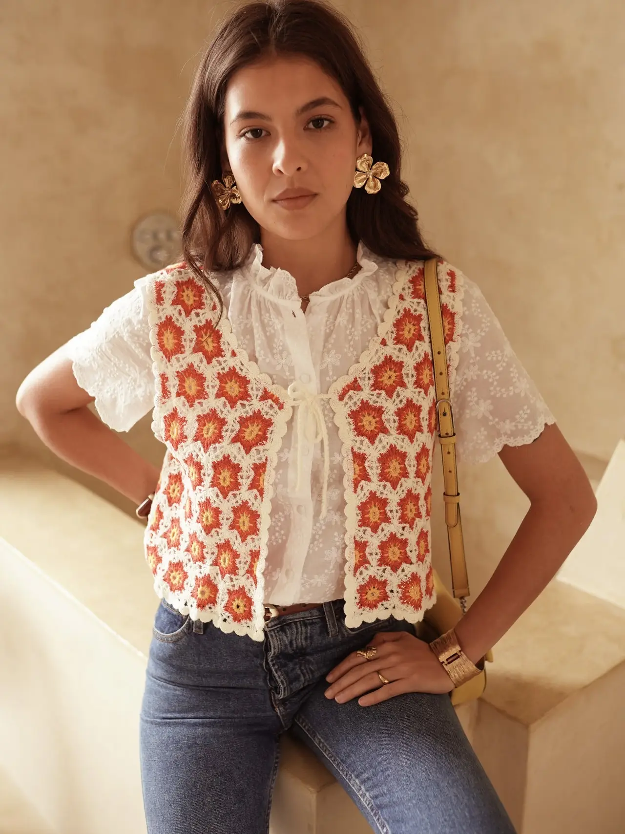Sa coupe courte sans manches avec son lien à nouer sur le devant en font une pièce bohème et féminine, facile à porter au quotidien. 95% coton 5% polyamide