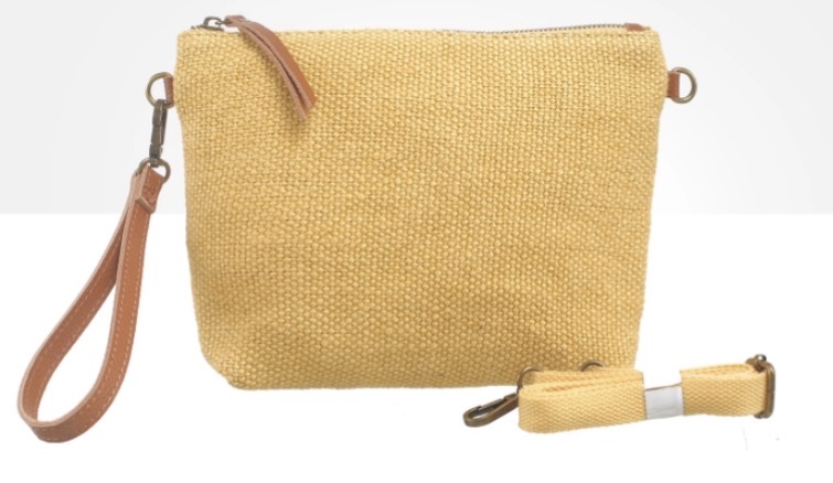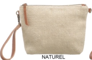 Pochette bi-matière en toile de jute et garniture en cuir.