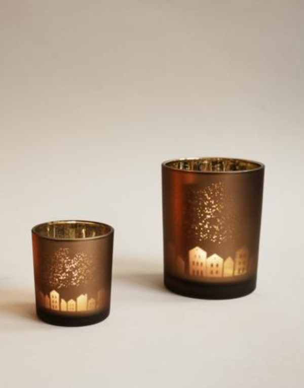 Ce joli photophore en verre brun et sa ribambelle de maisons fera un effet festif sur une table, un bord de fenêtre……..