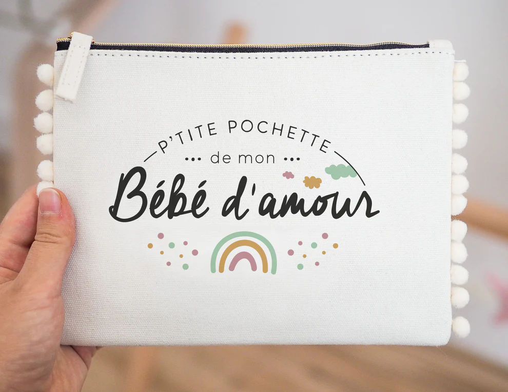 Une jolie pochette avec des pompons sur les côtés pour ranger les petites affaires de bébé chouchou.