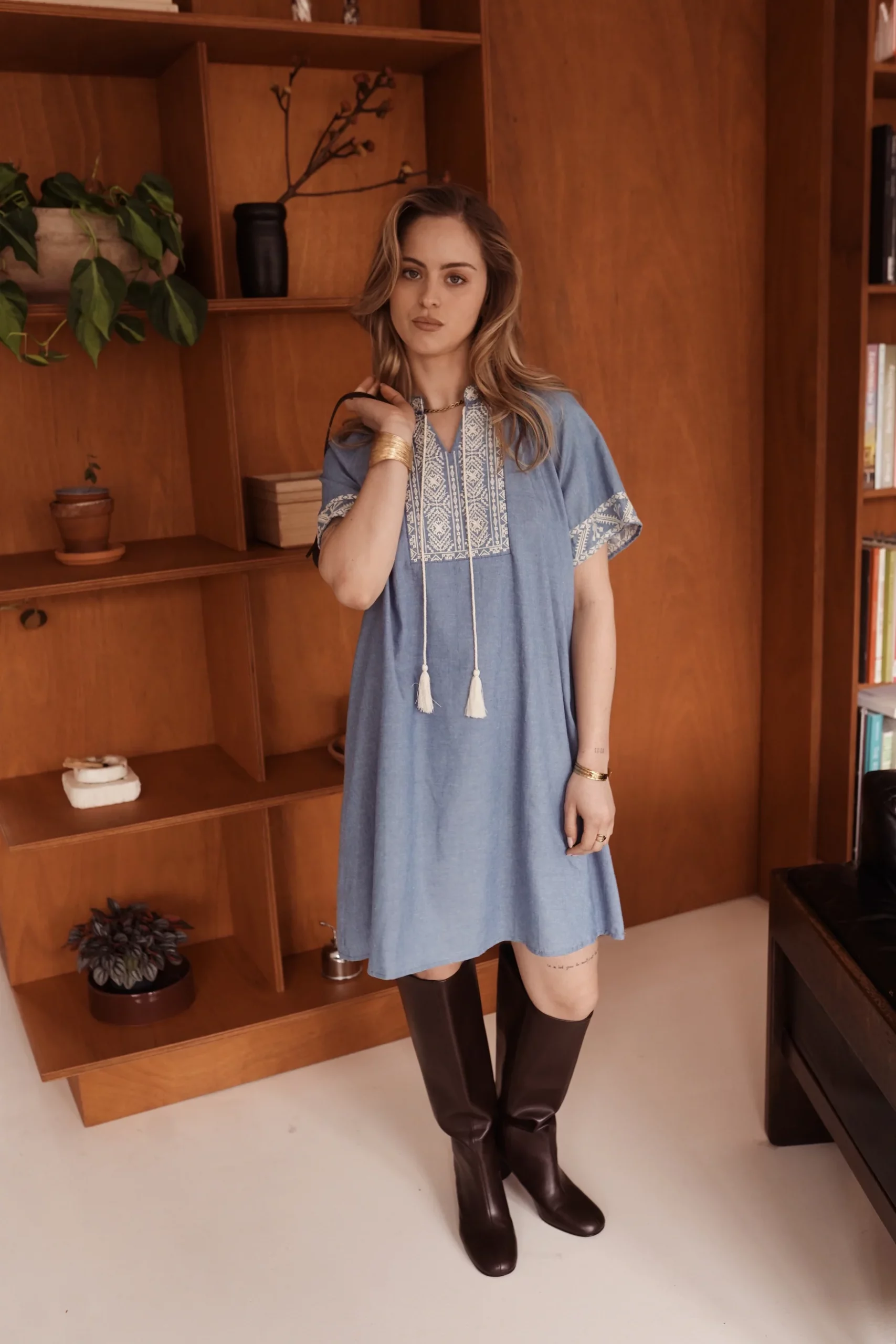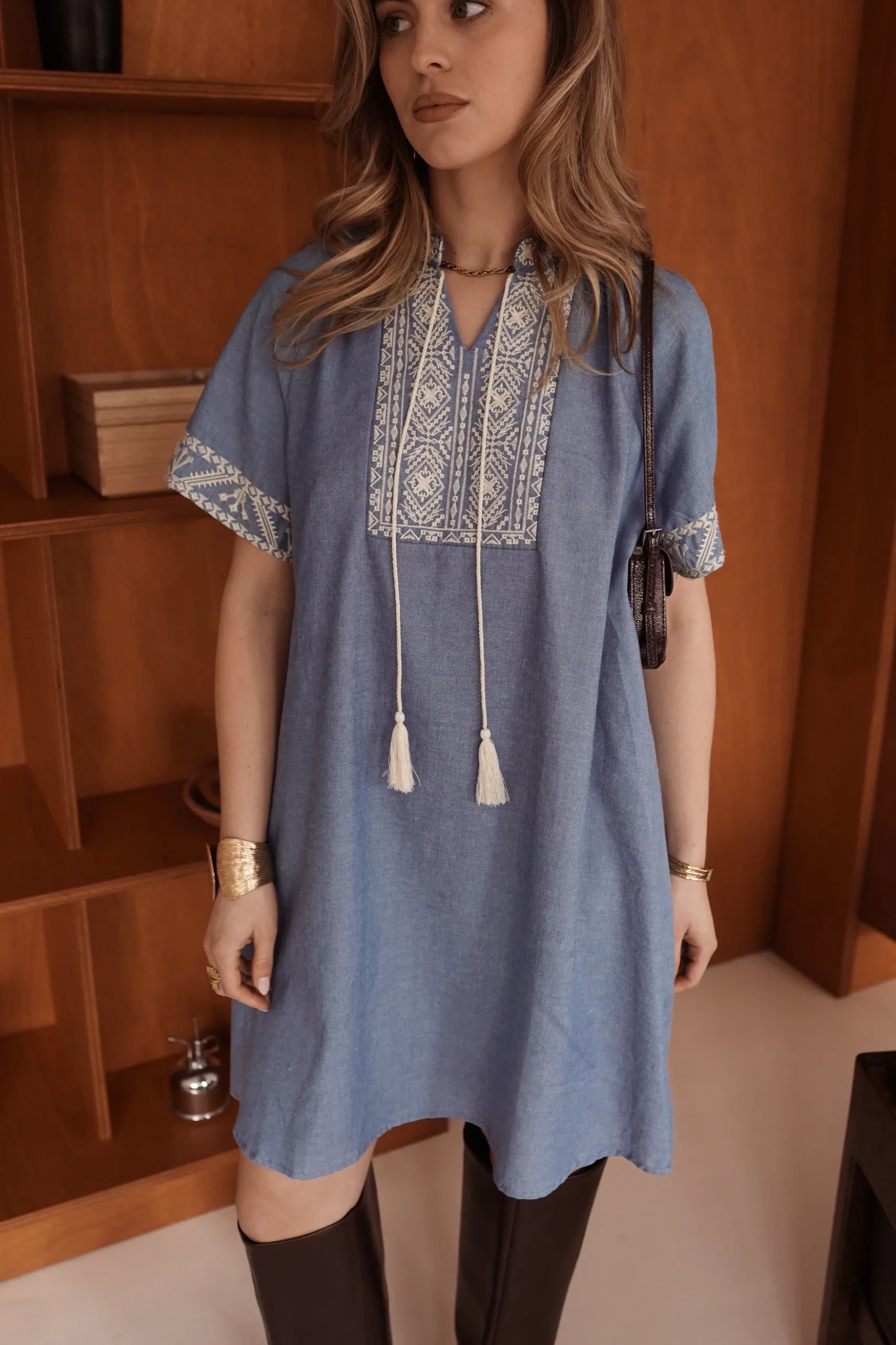 Robe en tissu léger à l’aspect jeans denim avec de jolies broderies graphiques sur le plastron et les manches, encolure ouverte avec liens à pompons.