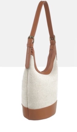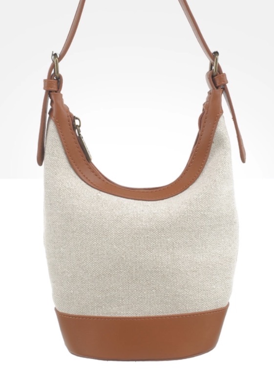 Sac à main à porter sur l’épaule. Bi-matière, sangle et garniture camel en synthétique et toile de coton.