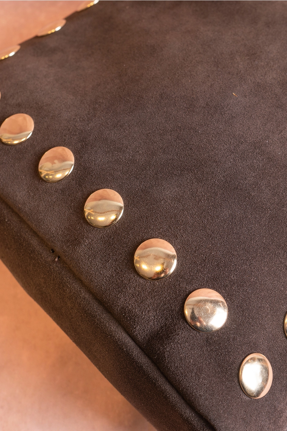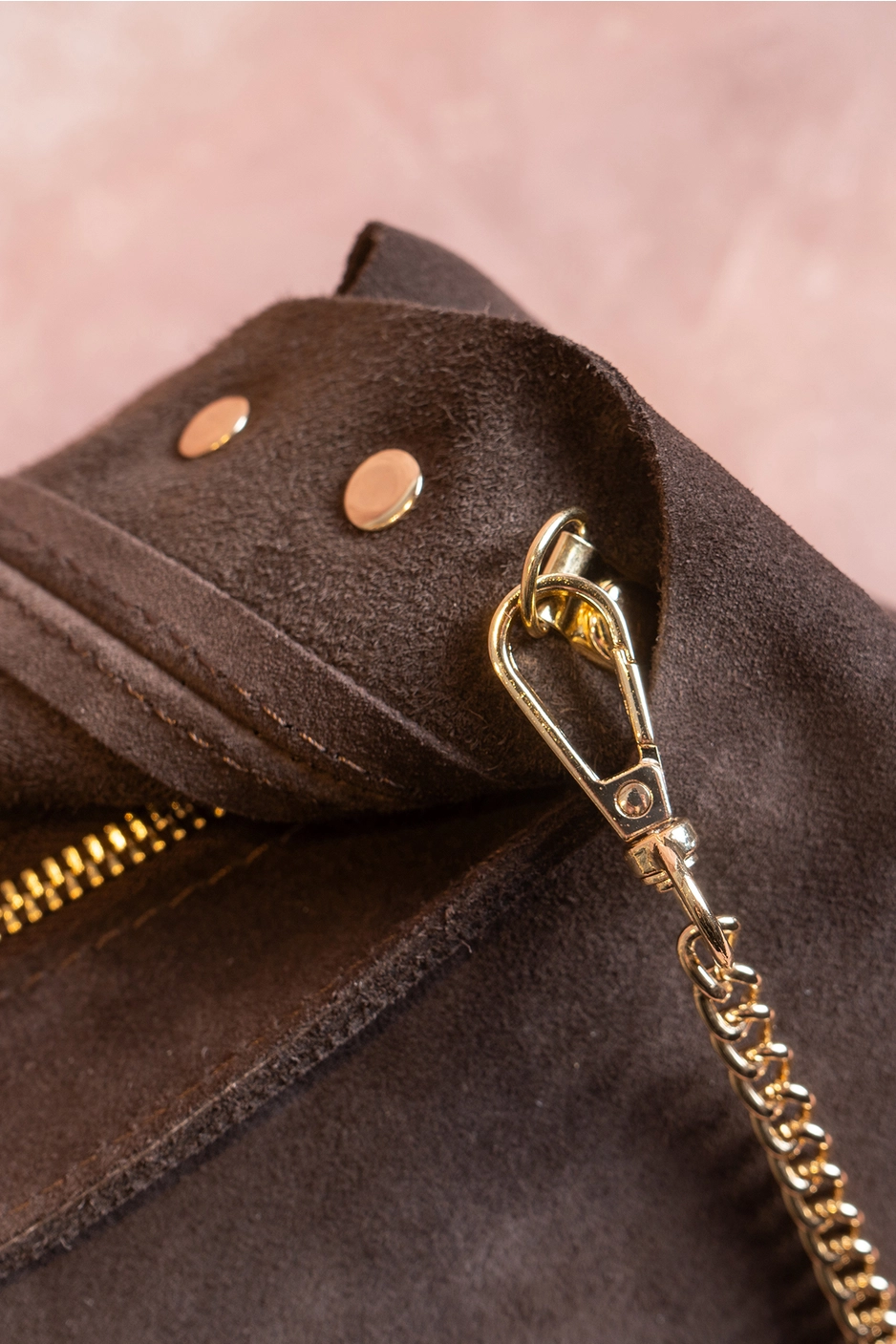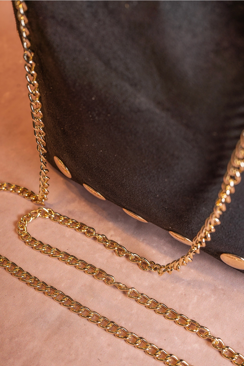 Fermeture principale zippée dorée – Bandoulière en chainette dorée amovible – Clous dorés sur le devant du sac.