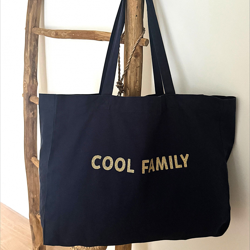 Shopping Bag 100 % coton Oekotex délavé pour un look hyper stylé et décontracté, coloris bois de rose avec son imprimé pailleté ou « Cool Family »