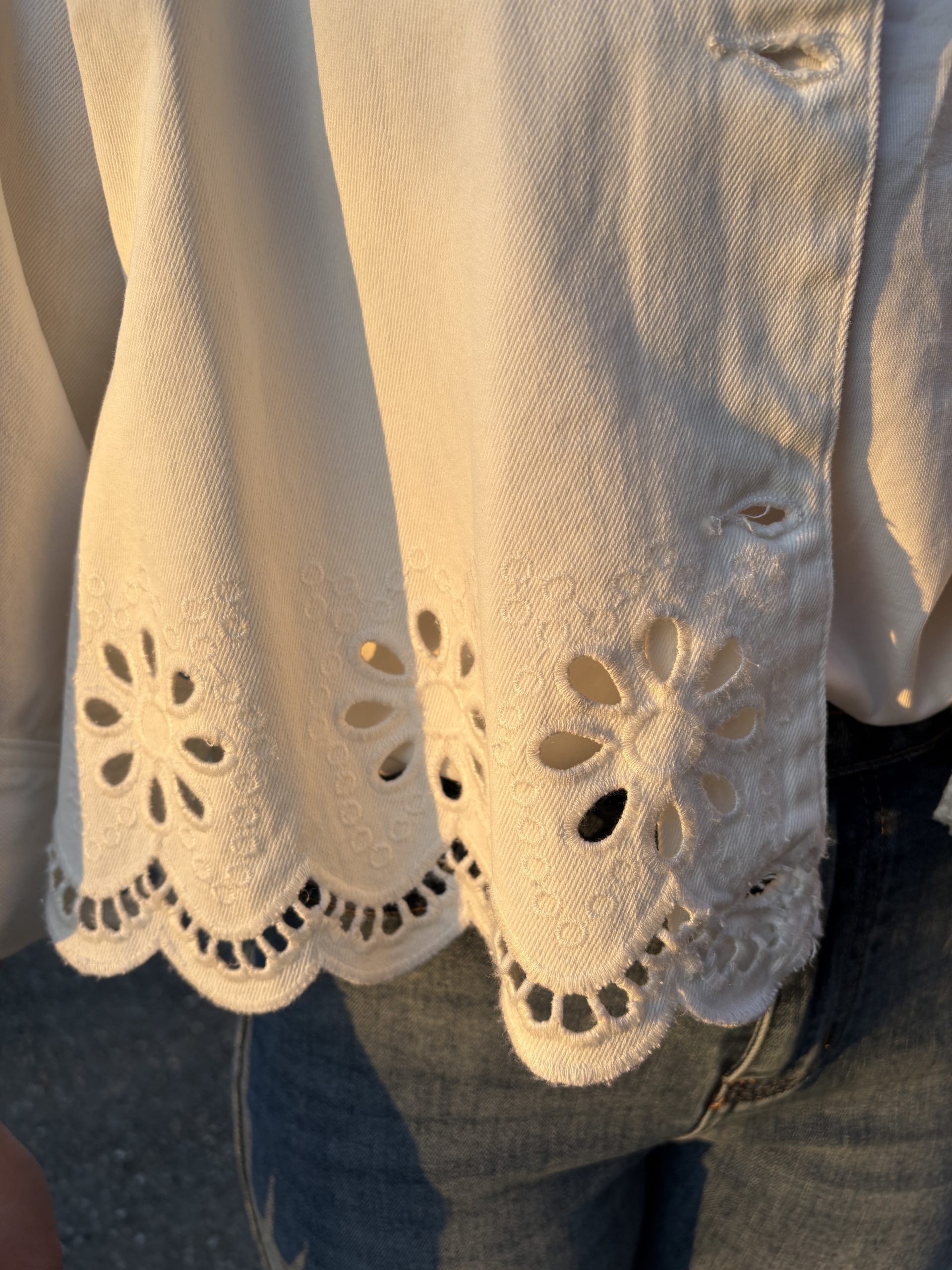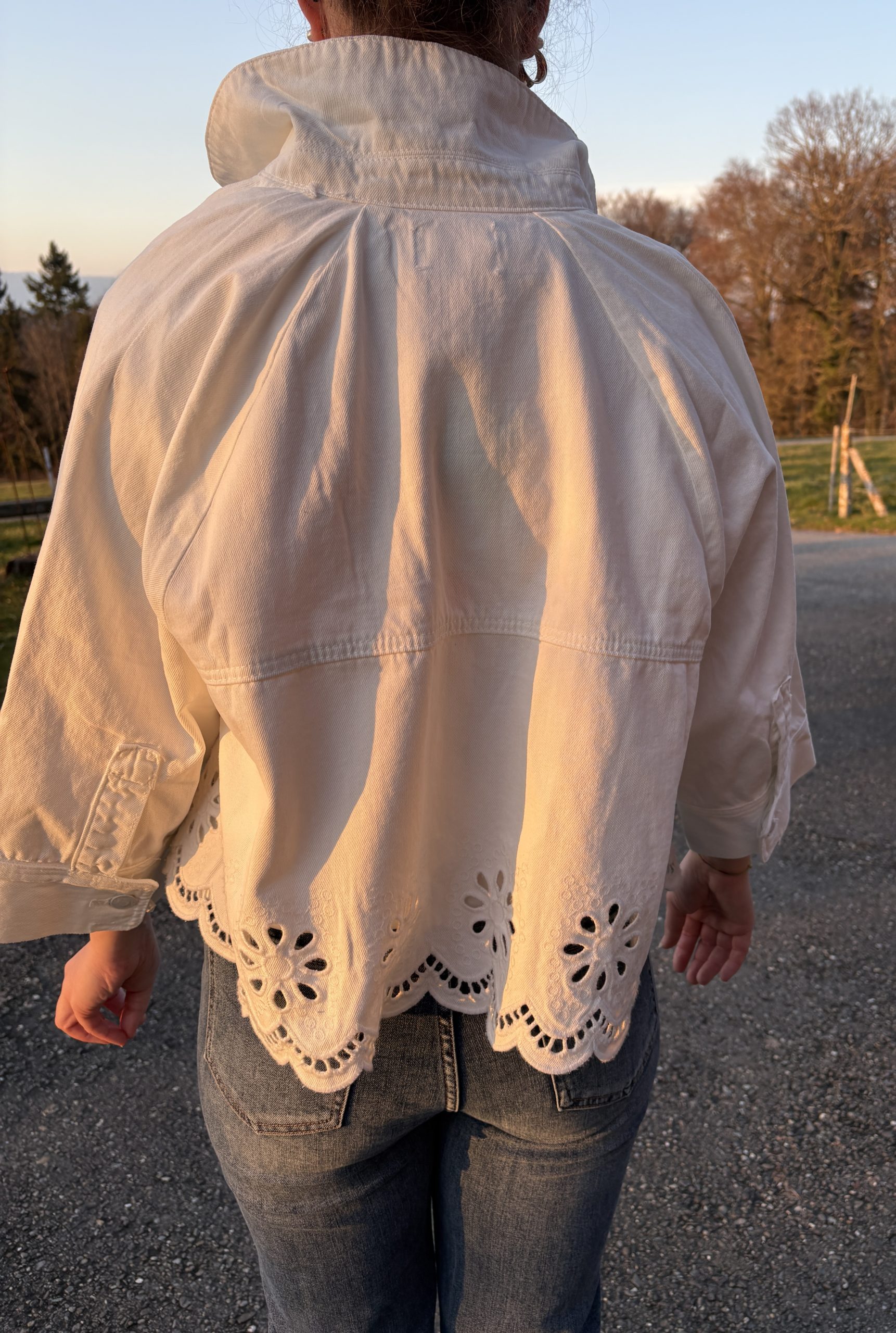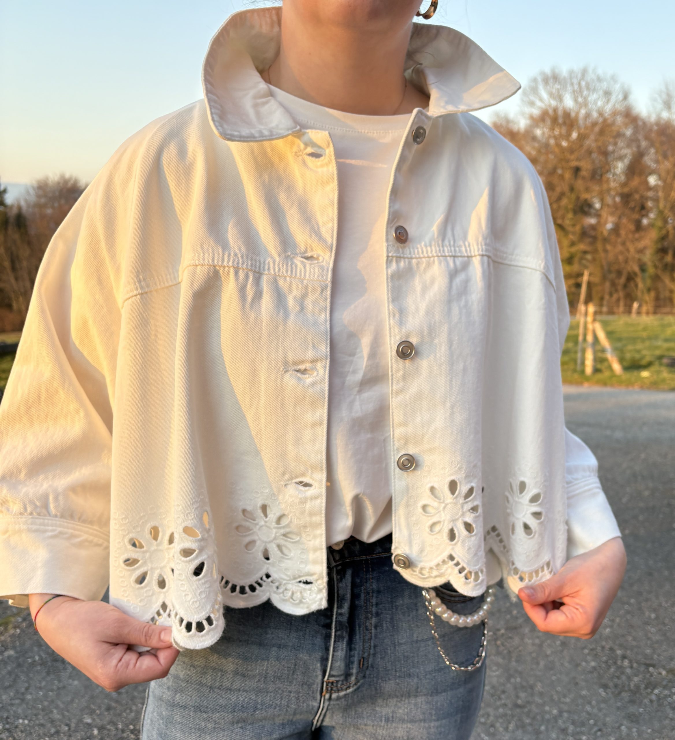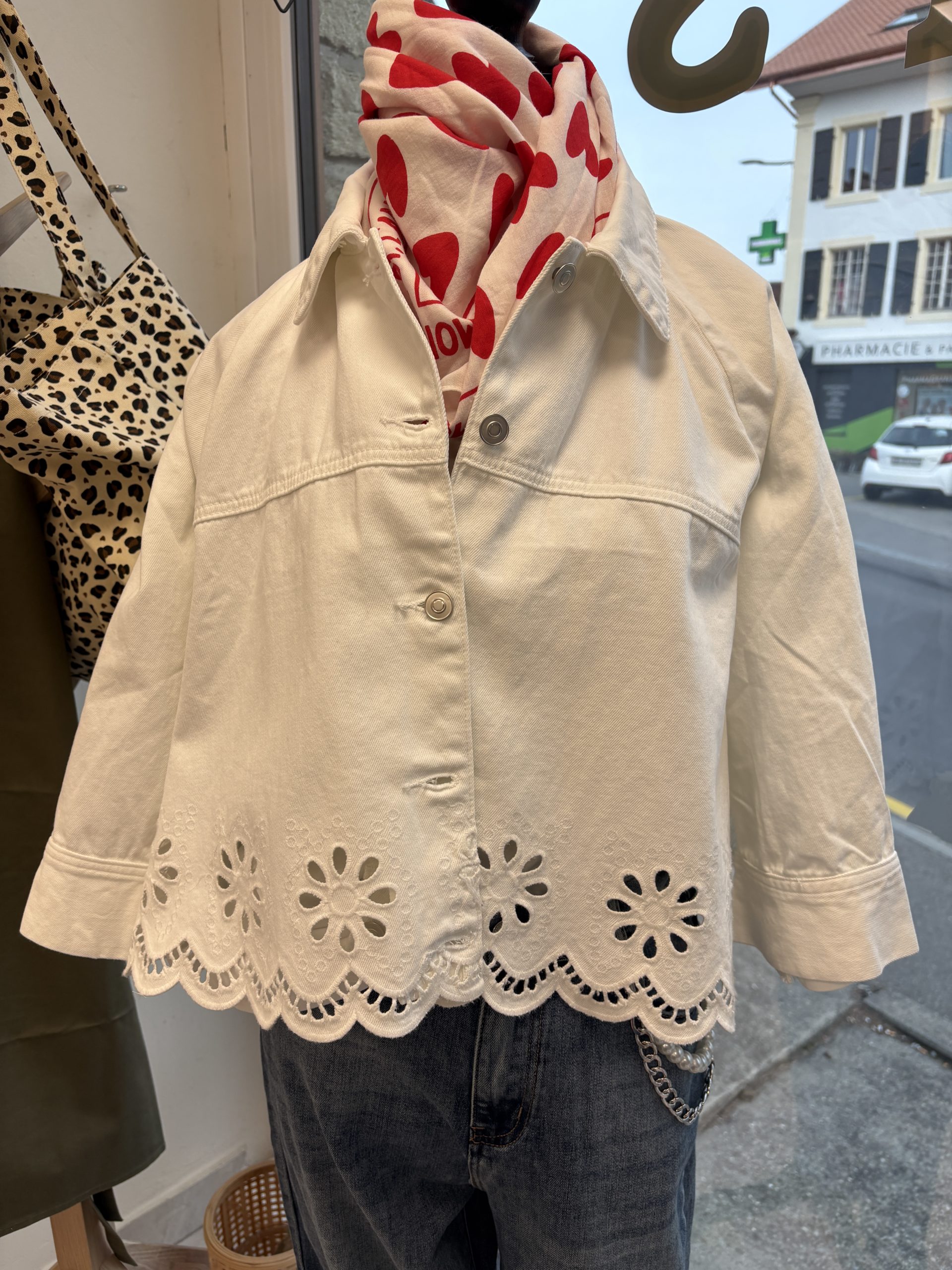 Jolie veste blanche avec une coupe évasée, une base dentelée. Longueur des manches 3/4.