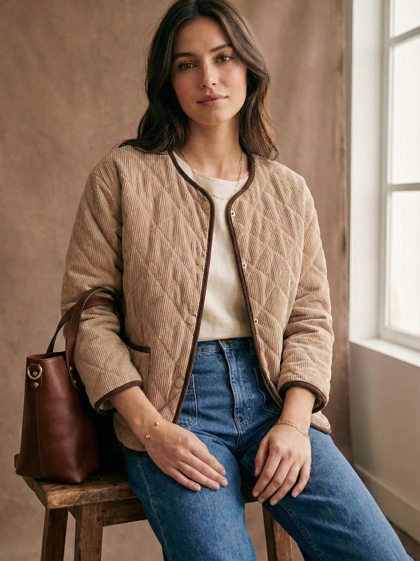 Veste matelassée en velours côtelé beige