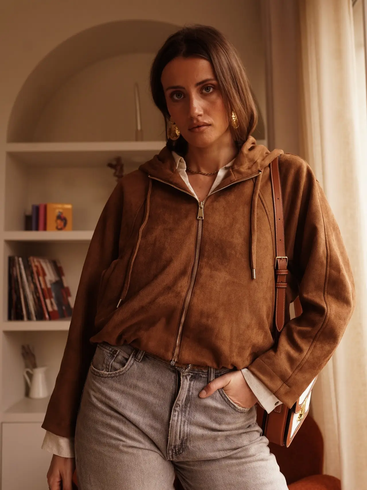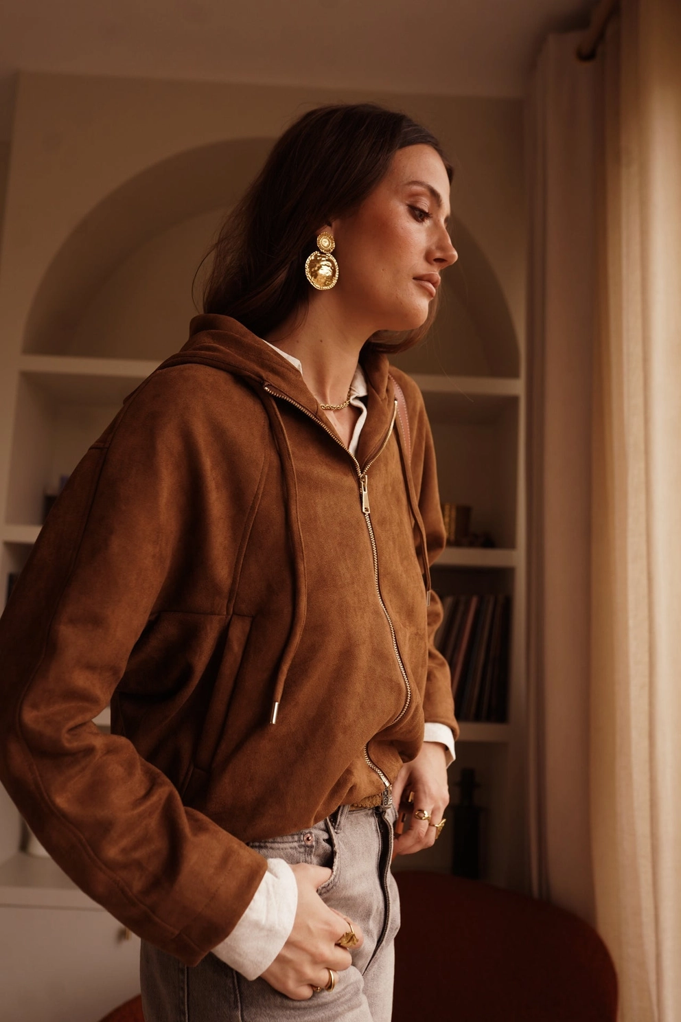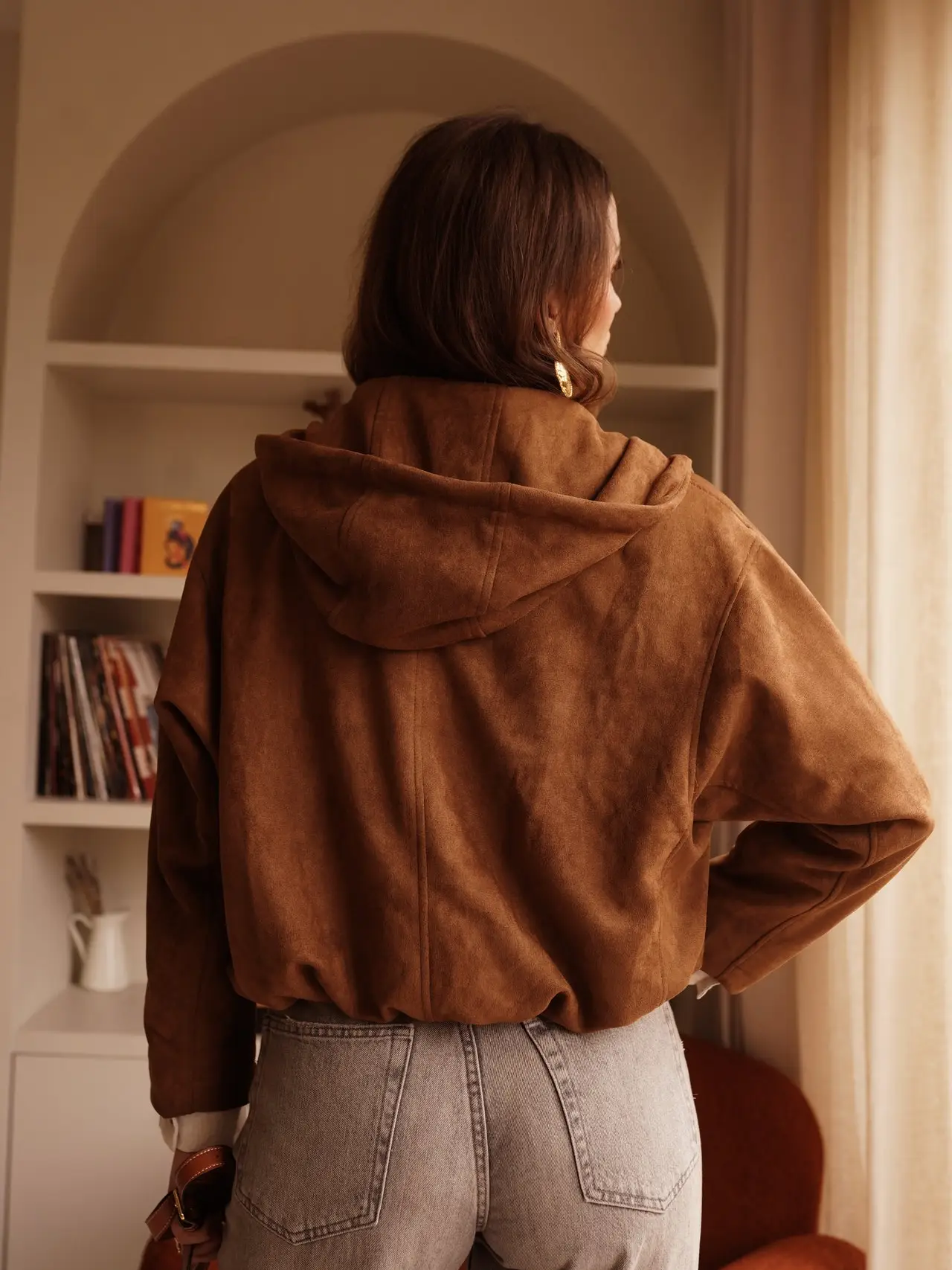 Adoptez un style à la fois chic et décontracté avec cette superbe veste à capuche en suédine douce. Sa texture veloutée apporte une touche d’élégance naturelle à toutes vos tenues.